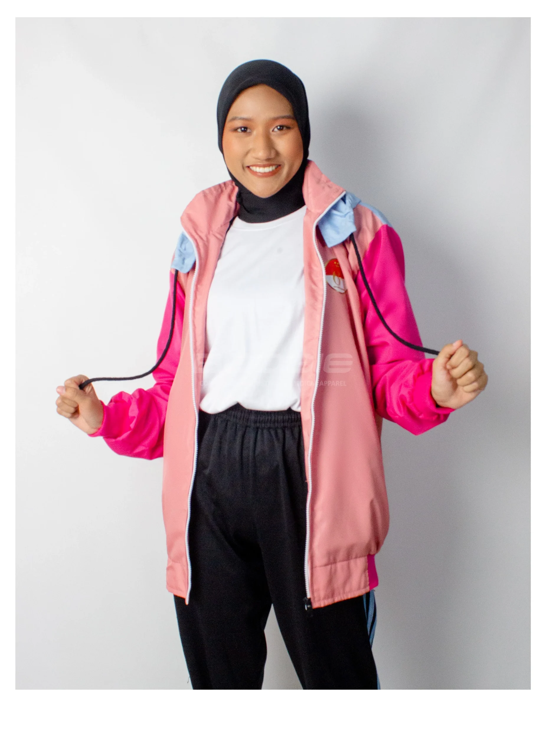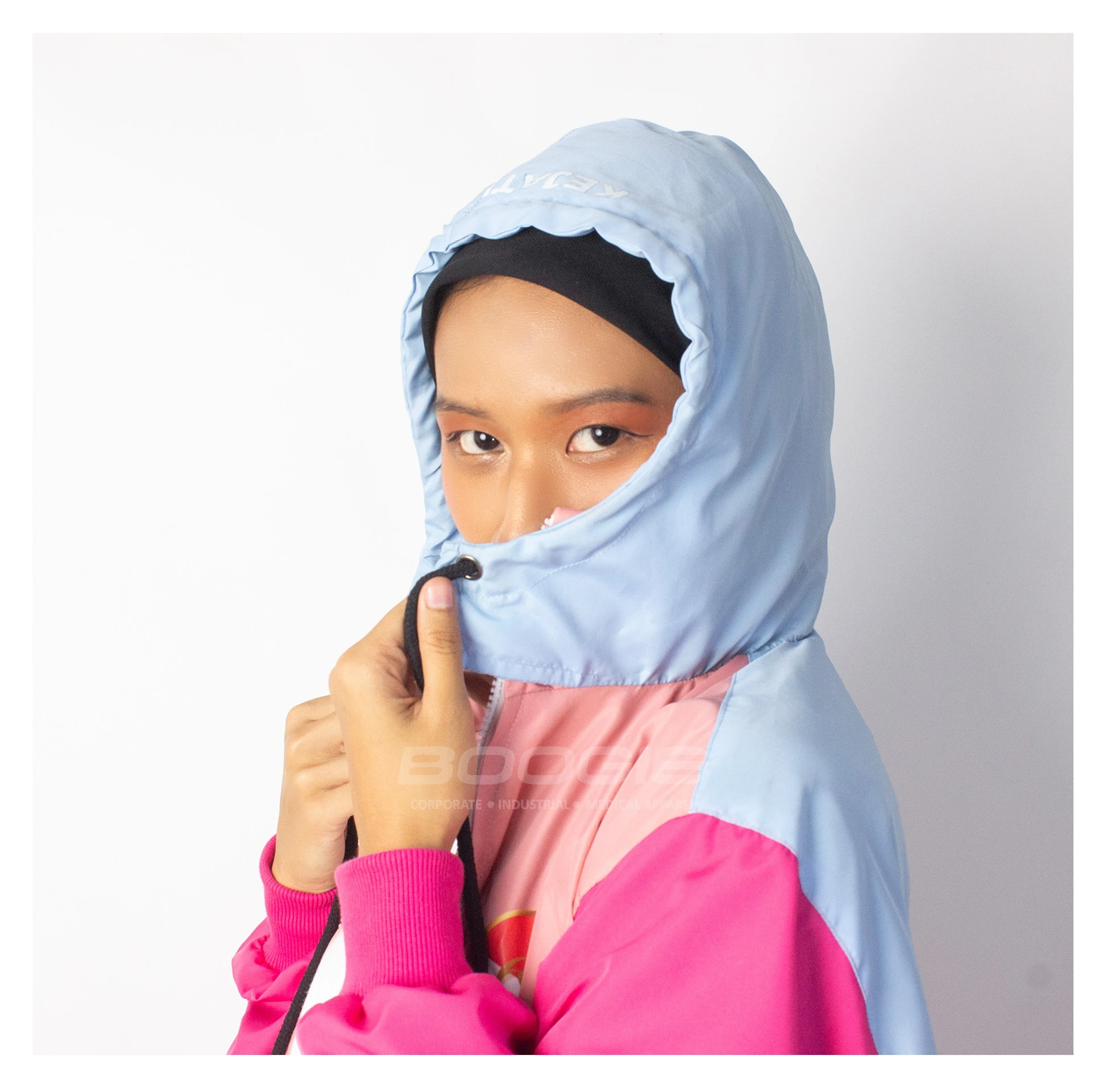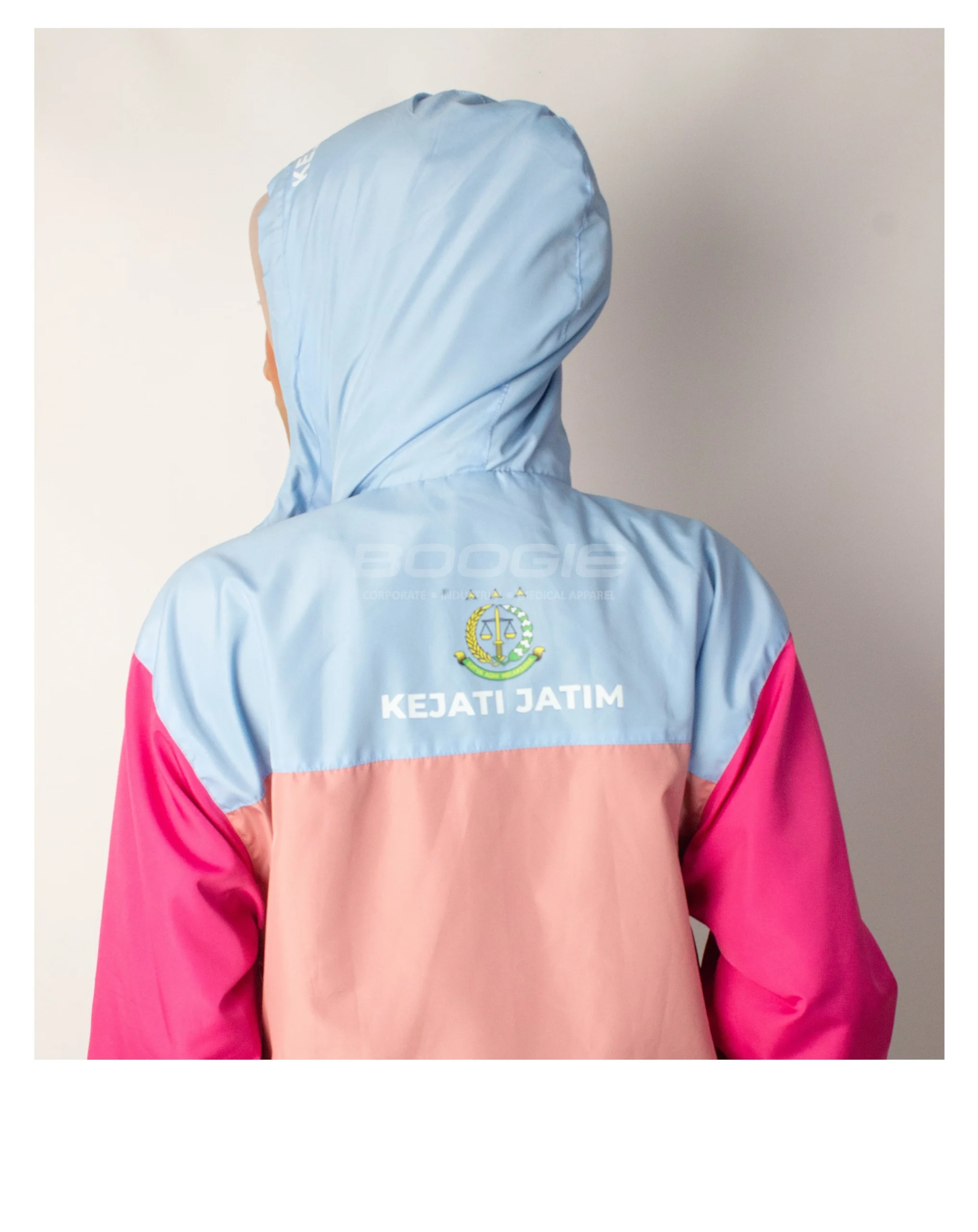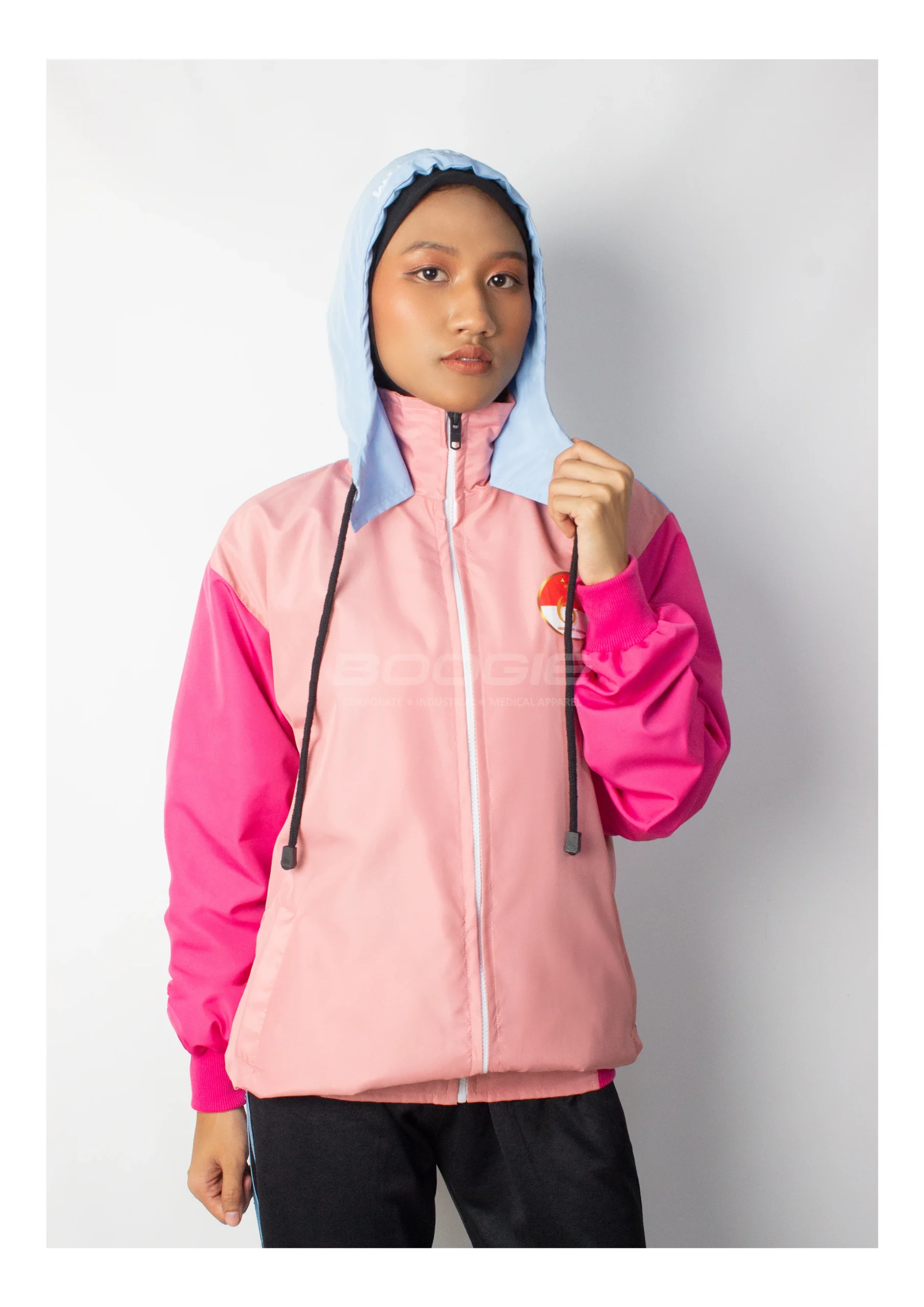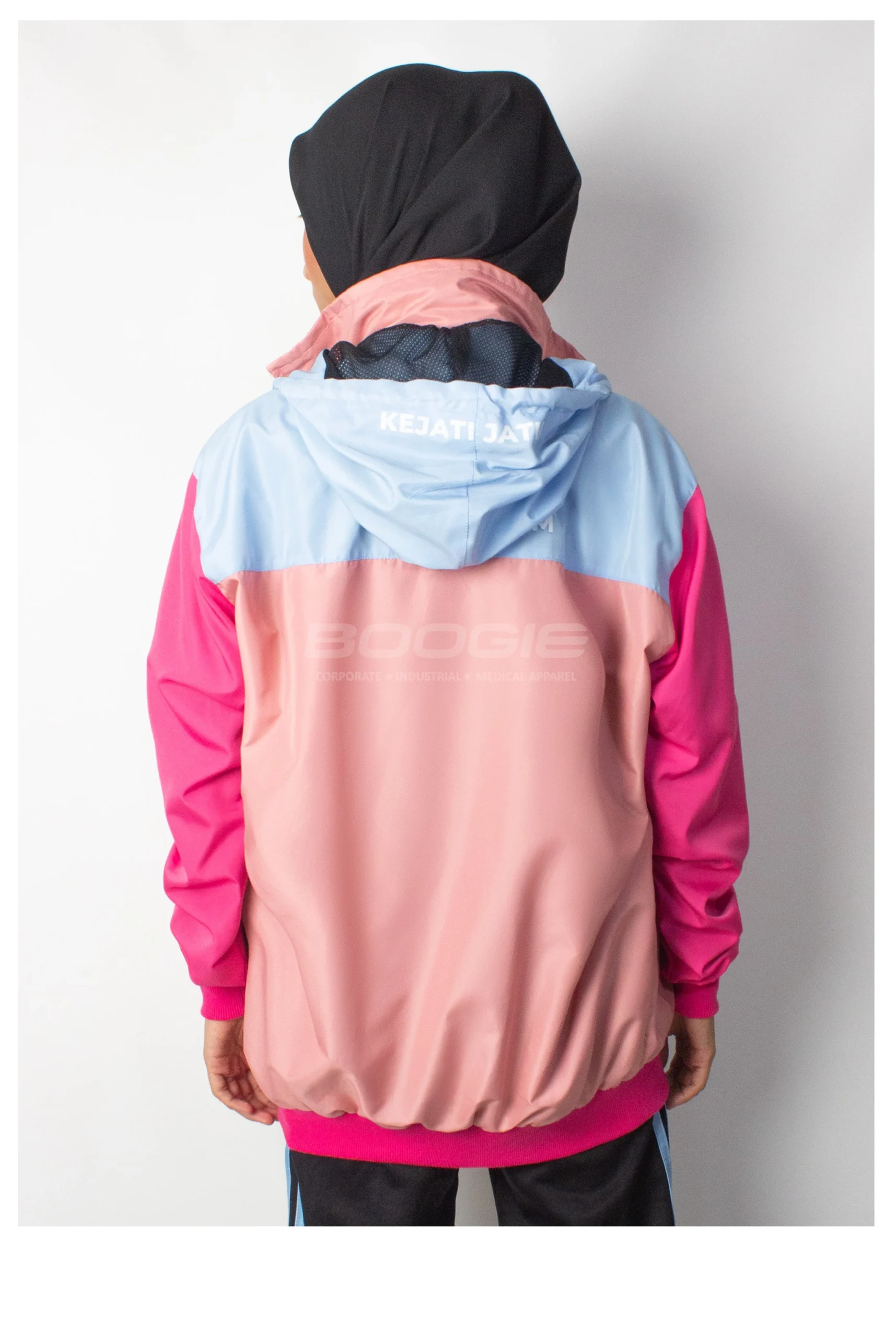 Tampil segar dan energik dengan kombinasi warna pink pastel, fuchsia, dan baby blue yang ceria, dilengkapi hoodie adjustable dengan tali drawstring hitam untuk perlindungan kepala yang optimal. Zipper putih di bagian depan memberikan aksen kontras yang stylish, sementara rib katun pada manset memastikan fit yang pas dan nyaman di pergelangan tangan.