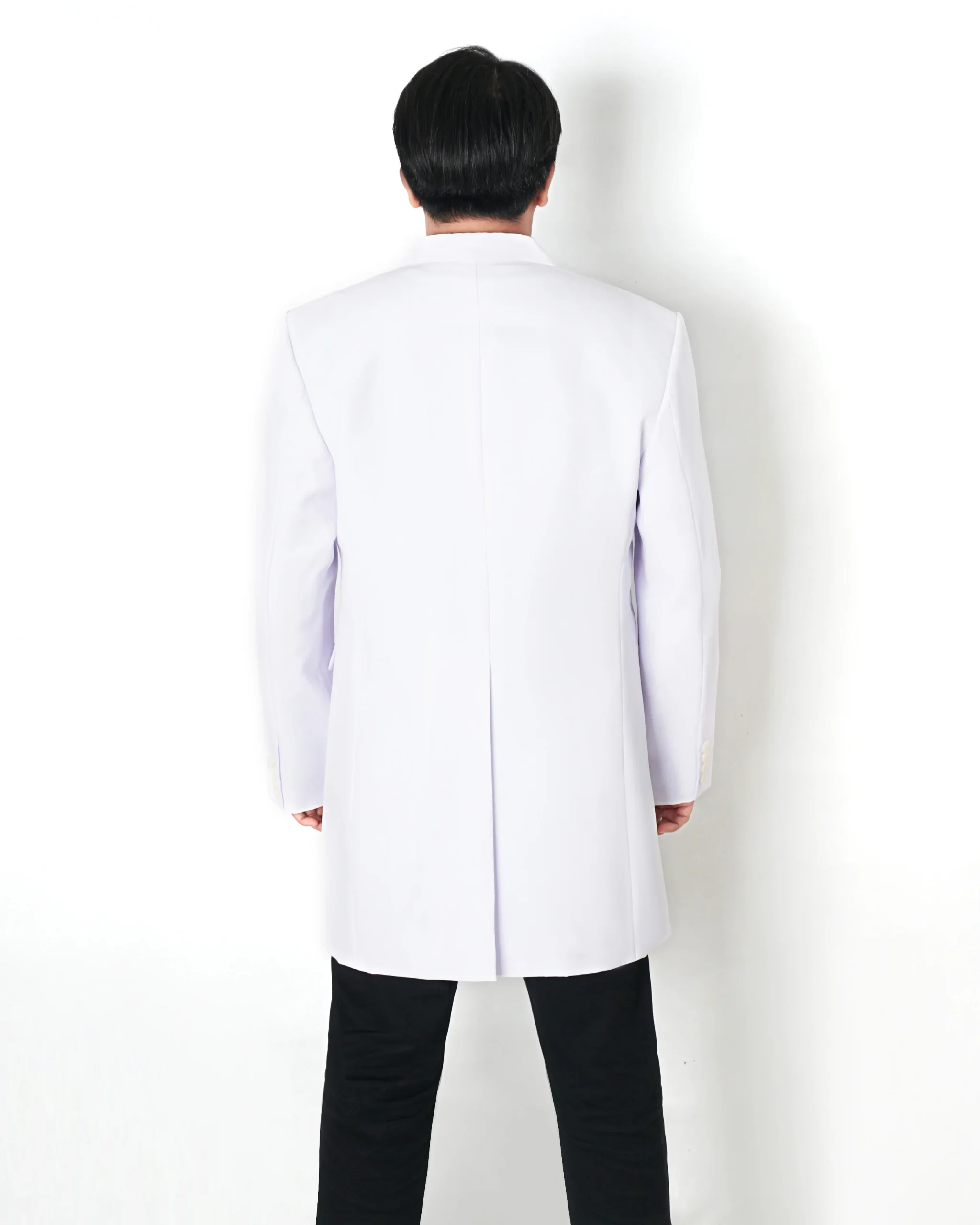 Tampil bersih dan elegan dengan warna putih bersih yang mencerminkan profesionalisme dan kepercayaan, didukung potongan semi-formal dengan kerah jas yang rapi dan terstruktur.