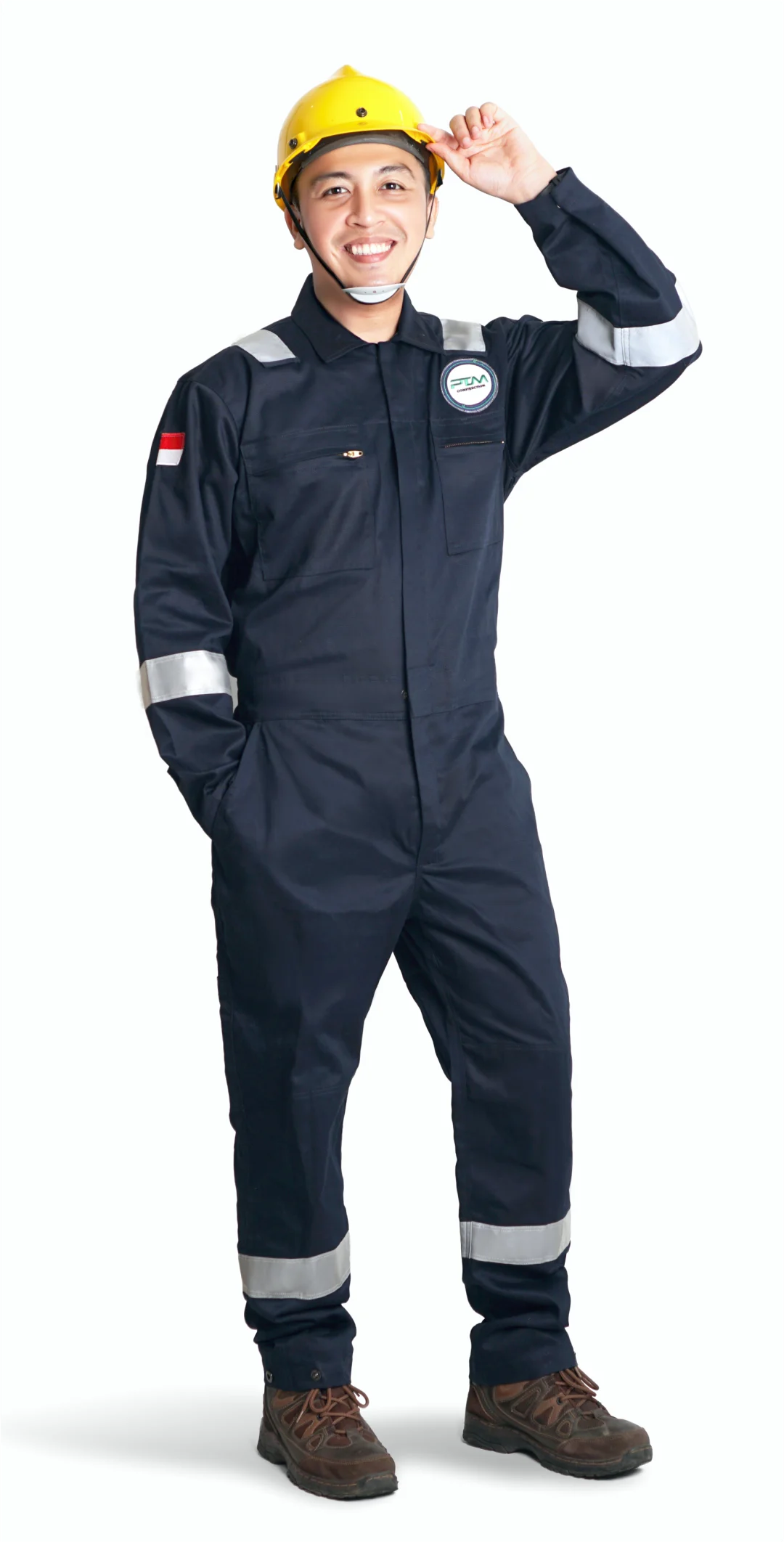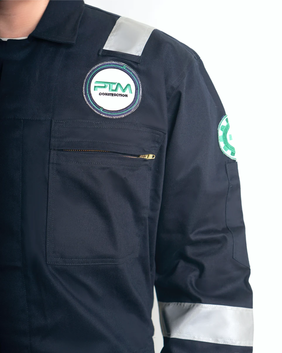Identitas perusahaan tampil resmi melalui patch bordir logo PTM di dada kiri serta patch bendera Merah Putih di lengan kiri yang mempertegas kebanggaan sebagai tenaga kerja Indonesia profesional.